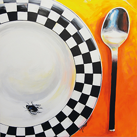 Wenn Sie nicht mehr alle Tassen im Schrank haben, auch keine Teller, weil Sie beispielsweise gerade frühstücken und Sie zum Lachen nicht in den Keller gehen müssen, dann sind Sie auf der Vernissage meiner Ausstellung im Artificium genau richtig. Hier servieren Martina Metzger, Laudatorin und Inhaberin der Galerie, und ich Ihnen Tassen, Teller und Temperamente gleich reihenweise und im Quadrat. Wenn Sie möchten, dazu auch noch einen Roten oder einen Weißen mit diesen kleinen temperamentvollen Perlchen. Und eigenes Temperament können Sie auch gut gebrauchen bei der Vollendung des noch unvollendeten Werks „Flower Power“ – Staffelei, Farben und Pinsel stehen bereit.