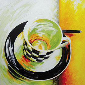 Wenn Sie nicht mehr alle Tassen im Schrank haben, auch keine Teller, weil Sie beispielsweise gerade frühstücken und Sie zum Lachen nicht in den Keller gehen müssen, dann sind Sie auf der Vernissage meiner Ausstellung im Artificium genau richtig. Hier servieren Martina Metzger, Laudatorin und Inhaberin der Galerie, und ich Ihnen Tassen, Teller und Temperamente gleich reihenweise und im Quadrat. Wenn Sie möchten, dazu auch noch einen Roten oder einen Weißen mit diesen kleinen temperamentvollen Perlchen. Und eigenes Temperament können Sie auch gut gebrauchen bei der Vollendung des noch unvollendeten Werks „Flower Power“ – Staffelei, Farben und Pinsel stehen bereit.