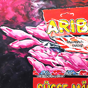 Ein guter Grund, sich der Geschichten rund ums Essen und Trinken mit Leinwand und Acryl anzunehmen. Die Erzählung bleibt den jeweiligen im Alltag meist unbeachteten Gegenständen überlassen. So kommt die tagtäglich lapidar in den Abfluss kopfüber abgestellte Kaffeetasse genauso zu ihrer Anerkennung wie das Spiegelei im Singlehaushalt, die kultige Bratwurst auf dem Pappteller oder der Blümchenkaffee und der orakelnde Kaffeesatz. Nicht zuletzt sind es der leergegessene Pizzateller und die nicht gerade appetitliche Fliege am Tellerrand. Die kryptischen Bildtitel helfen der Erkennung der Geschichten auf die Sprünge.