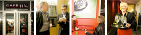 13. Oktober 2011 konnte ich mir denn auch ein Bild von seiner Idee der kommunikativen Komposition von Bistro und Bildkunst machen. Über die Wahl der Wandflächen und dem Mut zur Wandfarbe bin ich begeistert. Jedes der überwiegend türkisgrundigen Bilder hat nicht nur seine eigene Fläche „zum Atmen“, sondern wird durch das kontrastierende Rot der Wände in seiner Lebendigkeit zusätzlich unterstützt. Einfach perfekt. Wem nach einer Pause mit einer wirklich guten Tasse Kaffee ist, schaut einfach mal rein: